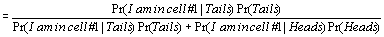 What you should think at stage (b) seems to follow from this. If you continue to accept a prior probability of heads equal to 50%, and conditional probabilities of being in cell #1 equal to 1% (or 100%) given Heads (or Tails), then it follows from Bayes’s theorem that after finding that you are in cell #1 in order to be coherent you must assign a posterior probability of Heads that is equal to 1/101, and a posterior probability of Tails that is equal to 100/101.[6] In other words, you go from being completely ignorant about how the coin landed (50% probability of Tails) to being quite confident that it landed tails (99% probability).[7]